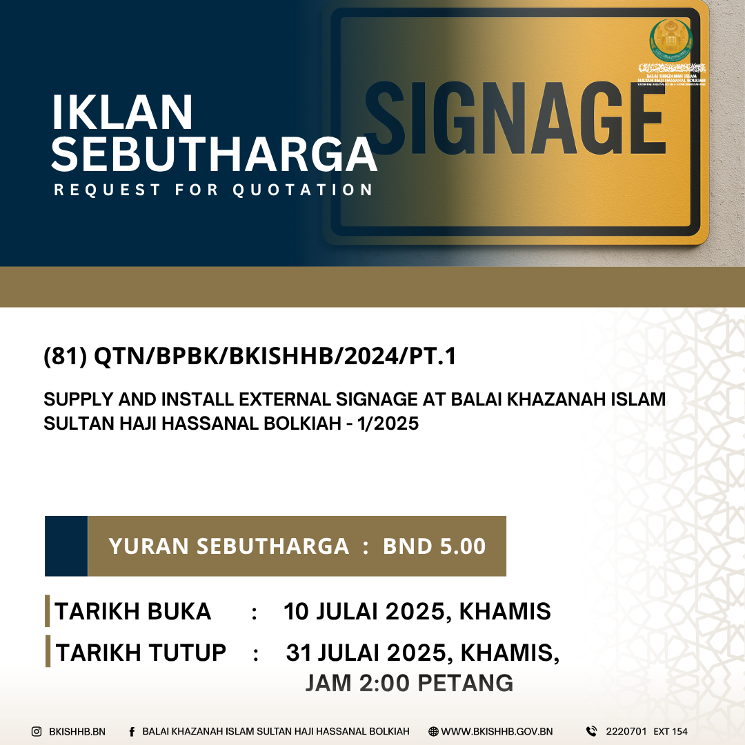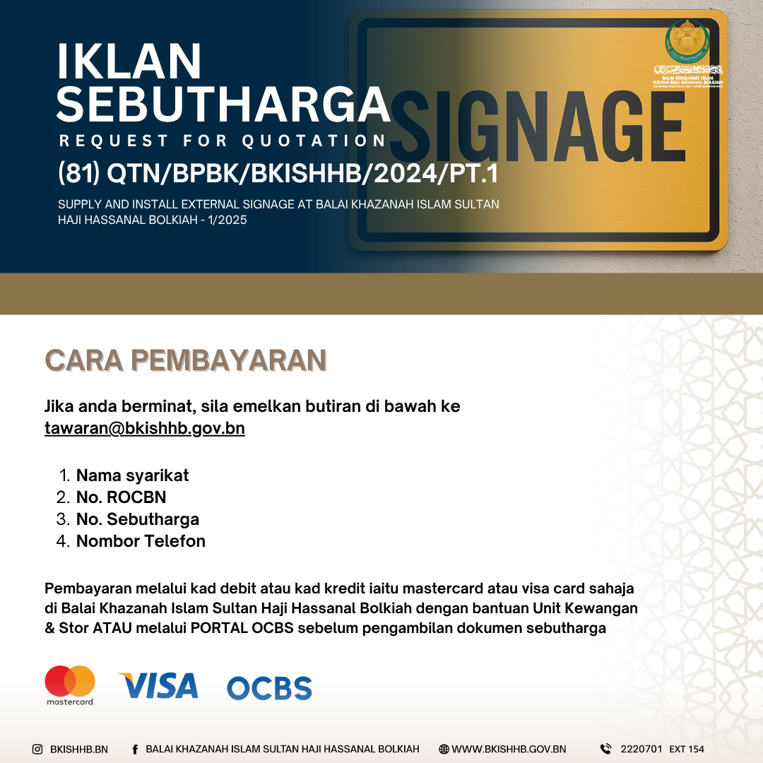 To view the latest quotations at Balai Khazanah Islam Sultan Haji Hassanal Bolkiah, please pay close attention to the “If interested, please contact/collect” column for instructions on how to collect or inquire further about the requested quotations or tenders. Ensure to follow the steps outlined in the column for proper collection or contact details.