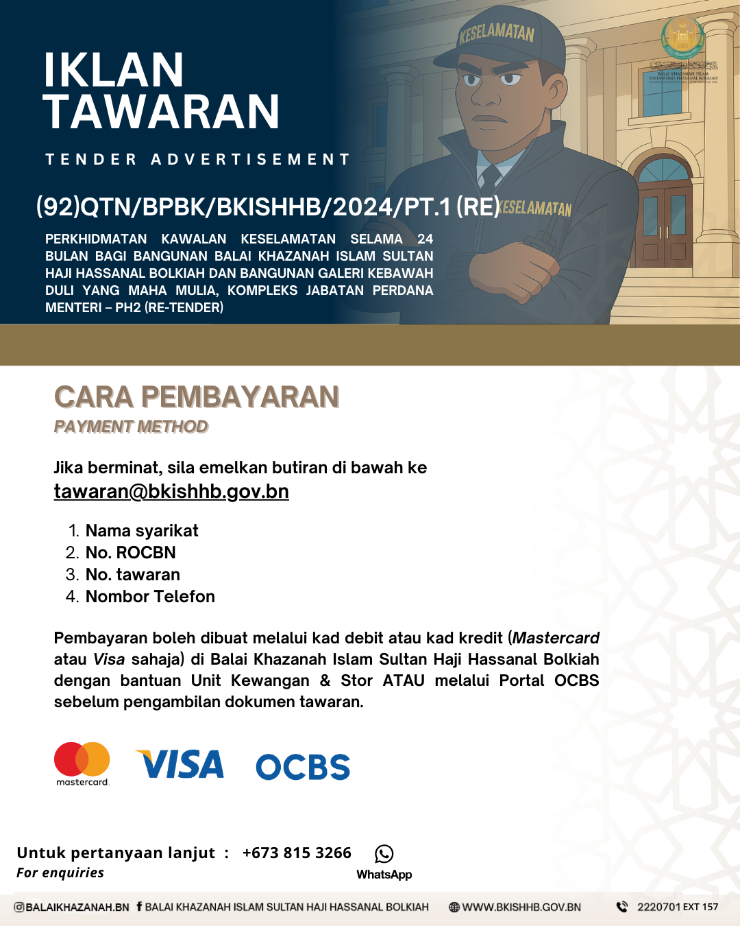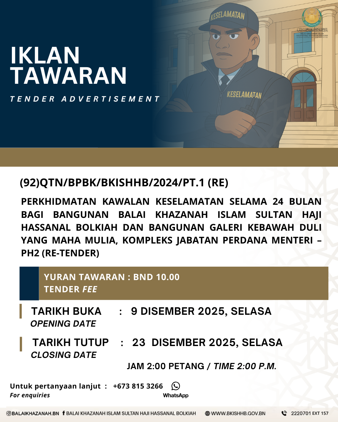 To view the latest quotations at Balai Khazanah Islam Sultan Haji Hassanal Bolkiah, please pay close attention to the “If interested, please contact/collect” column for instructions on how to collect or inquire further about the requested quotations or tenders. Ensure to follow the steps outlined in the column for proper collection or contact details.